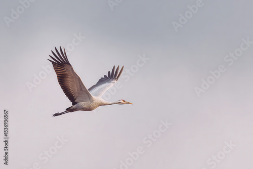 minimalist photograph of single colored crane set against light gray sky in denmark essence of seasonal transition