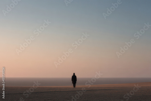 minimalist photograph of solitary figure standing in russian steppe landscape during golden hour