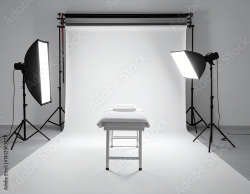 minimalist photography studio setup featuring massage table, soft lighting, and clean backdrop creates serene atmosphere for capturing images. arrangement emphasizes simplicity and professionalism