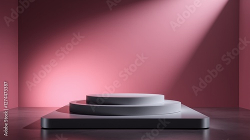 Minimalist podium in front of a radiant spotlight against a gradient pink background.