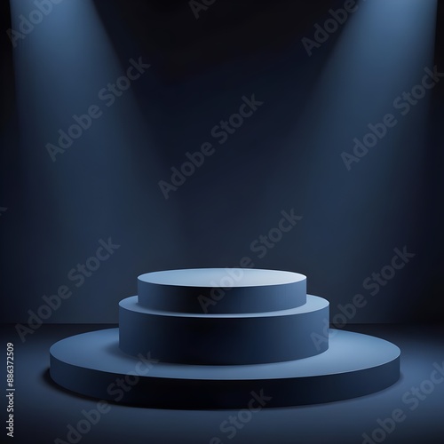 Minimalist podium on a navy blue background, designed as an impactful stage for product unveilings or copy space