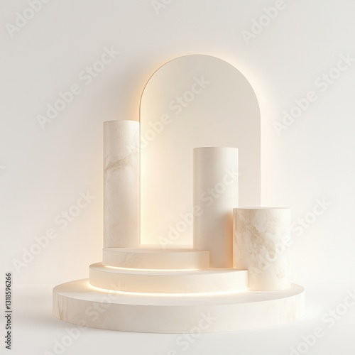 Minimalist podium with soft beige and ivory tones highlighted by elegant lighting