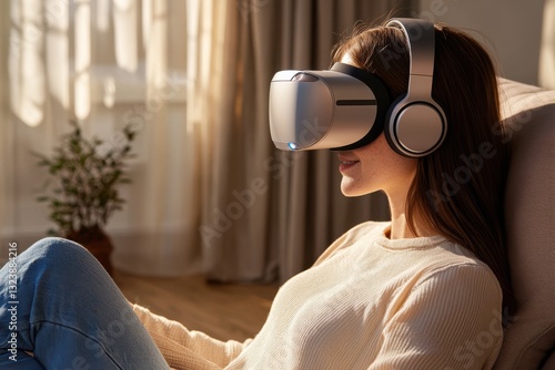 Minimalist portrait of a woman with a high-tech VR headset, symbolising innovation and progress.