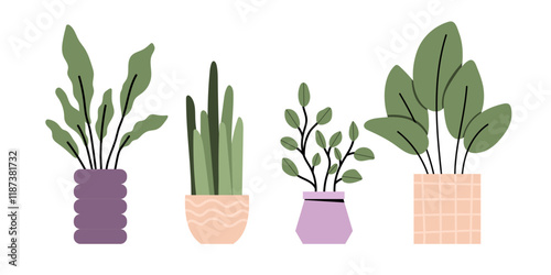 Minimalist potted plants with decorative vases on a white background. Vector set of Flower Pots