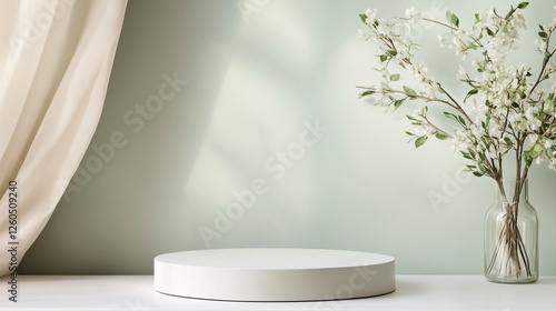 Minimalist Product Display: A pristine white circular podium rests against a calming sage green backdrop.