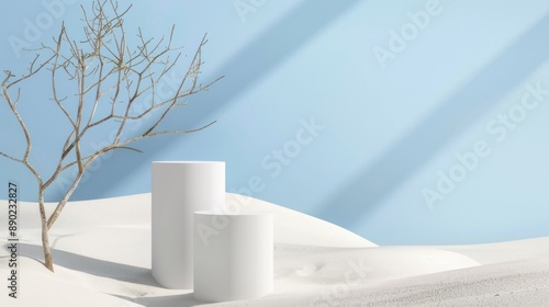 Minimalist Product Display with White Cylinders and a Bare Branch Tree in a White Sandscape