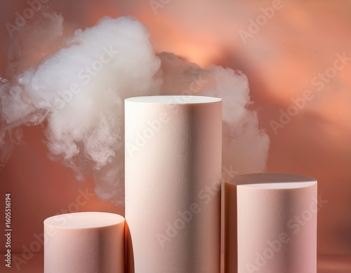 minimalist product showcase on cylindrical pedestals pastel tones peach beige white glossy surface smoke background winner concept mockup