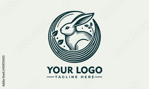 Minimalist rabbit sitting inside circular emblem in side profile, stylized animal icon. Nature concept