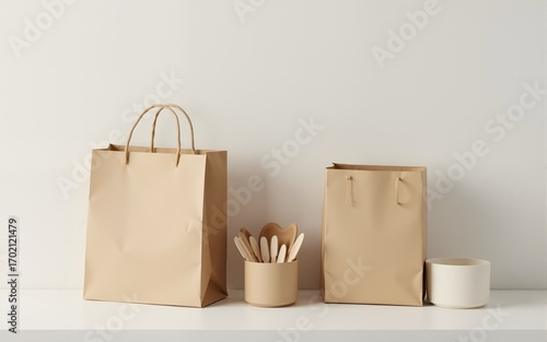 Minimalist Refill Station Mockup with Paper Bags and Wooden Spoons. High quality