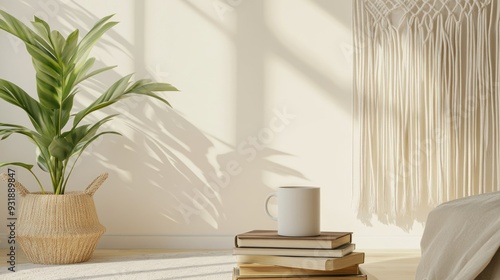 Minimalist Room Decor with Plant, Books, Mug, and Macrame Wall Hanging