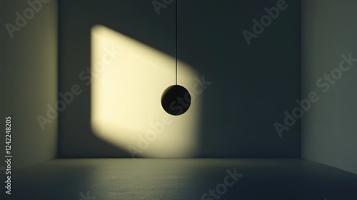 Minimalist room, hanging sphere, sunbeam, empty space, design concept