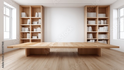 Minimalist room with wooden bookshelves and table