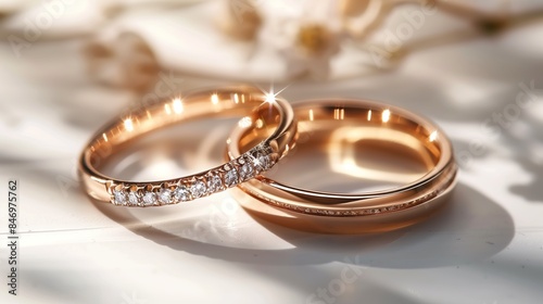 Minimalist rose gold wedding rings on white fabric background, elegant design
