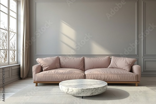 Minimalist, Scandinavian interiors in residential living rooms with light pink sofas and tables. Generative AI