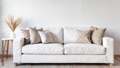 Minimalist Scandinavian sofa with decorative pillows in calm space, simplicity