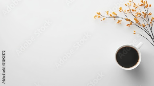 Minimalist scene with a coffee cup and autumn branches on a white background.