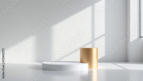 Minimalist scene with golden cylinder and white podium bathed in sunlight and shadows