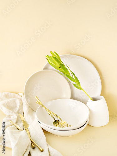 Minimalist set of empty crockery in natural day light with golden cutlery. Beige and earthy colours. Handmade ceramic, pottery, restaurant or catering concept. Copy space.