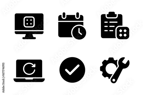 Minimalist silhouette icons of technology, calendar, clipboard, laptop, checkmark, and tools