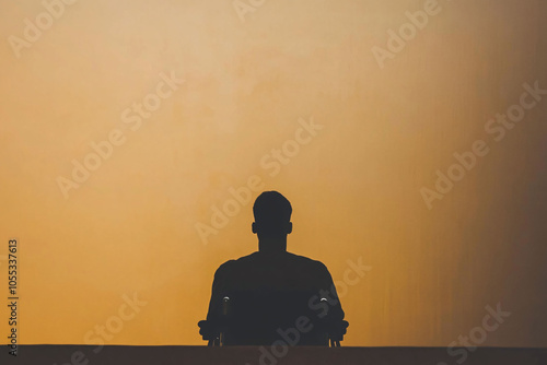 Minimalist silhouette of man in wheelchair against warm-toned background