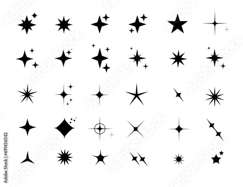 Minimalist silhouette Star icons, star shape vector set. Abstract y2k sparkles. Twinkling stars, abstract sparkle black silhouettes symbol shining burst. Vector