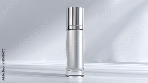 Minimalist silver cosmetic bottle on a light gray background. Modern skincare, beauty product mockup, and luxury packaging design template.