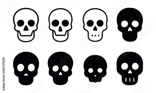 Minimalist skull icons set – simple, modern, creepy, design, decorative, outline, black, halloween. Vector icons set