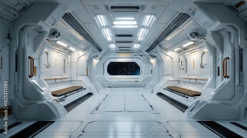 Minimalist Spaceship Interior with clean white surfaces hidden compartments and a single large window framing a nebula