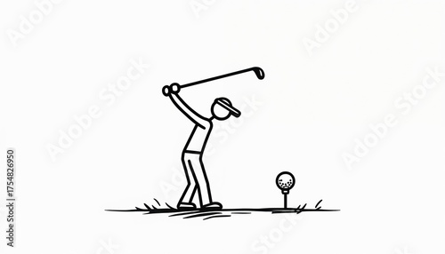 Minimalist stick figure golfer swings club. Person hits golf ball off tee. Simple black line drawing illustrates player in action. Cartoon graphic for game, hobby, exercise, sport, leisure, training,