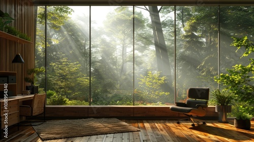 Minimalist study space with a large window view of nature