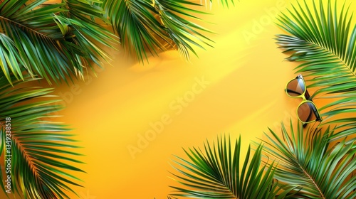 Minimalist summer concept with a palm tree beach sunglasses on blank yellow green background