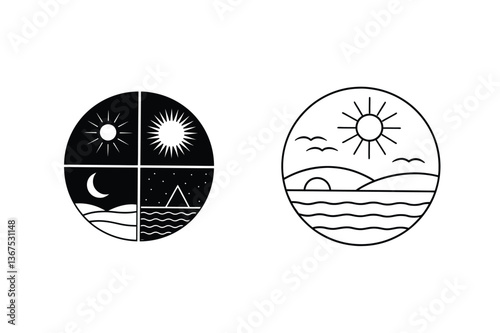 Minimalist Sun Moon Sea Landscape Line Art Circle Designs