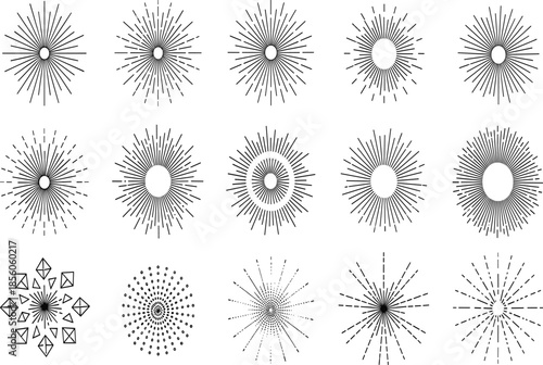 Minimalist sunburst and light-burst icon set featuring various radiating line patterns and circular starburst silhouettes for graphic design
