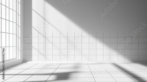 Minimalist, sunlit interior with white walls, tiles, and large windows