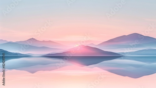 minimalist, surrealistic landscape with floating mountains and a calm lake, pastel colors, gradient sky, soft lighting, reflections on the water surface, delicate texture of hills, tranquility.