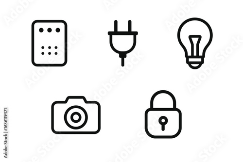 Minimalist technology and utility icons: braille, plug, lightbulb, camera, lock
