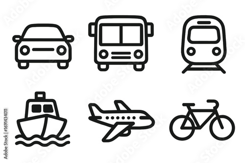 Minimalist transportation icons set featuring car, bus, train, boat, plane, and bicycle vector illustrations, simple black line art, travel and transit symbols, modern design