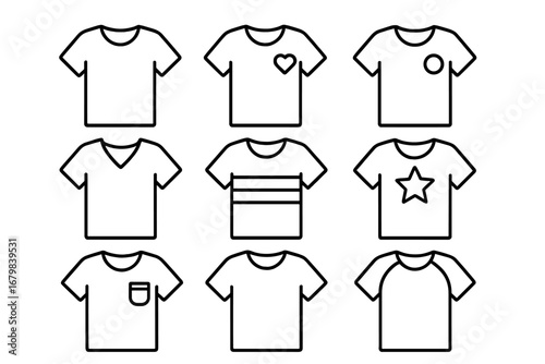 Minimalist T-Shirt Icon Set Editable Stroke Line Art, Outline Fashion TShirt Vector Collection with Transparent Background, Web Design, Apparel Template, Customizable Clothing Symbols