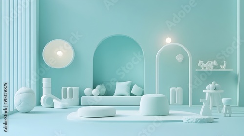 Minimalist Turquoise Playroom with White Geometric Furniture and Decor