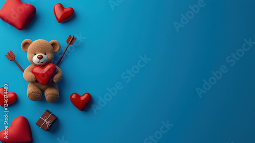 Minimalist Valentine's Day Banner with Cute Teddy Bear and Heart Icons on Blue Background