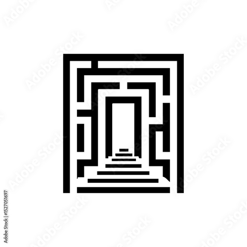 Minimalist vector icon of a maze ending in a doorway, symbolizing solution or escape.