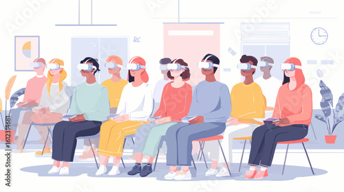 Minimalist Vector of Students Using VR Headsets in a Modern Classroom