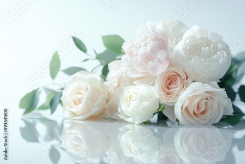 Minimalist wedding bouquet featuring elegant roses and soft peonies on a serene background