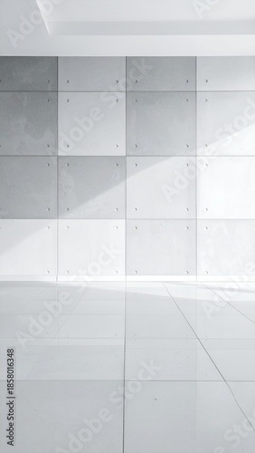 Minimalist White and Gray Tiled Room with Subtle Light and Shadow Play.