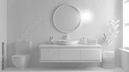 Minimalist white bathroom interior design with sink, toilet, mirror, and plant.