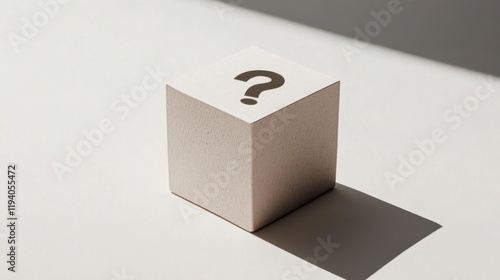 Minimalist White Cube with Question Mark Symbol on a Light Surface, Creating an Air of Mystery and Curiosity in a Simple yet Effective Composition