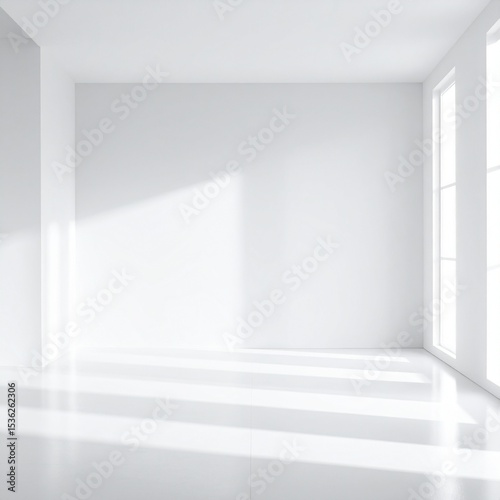 Minimalist White Interior with Potted Plant and Sunlight through Large Windows
