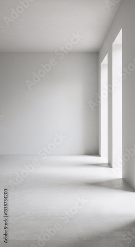 Minimalist white interior with sunlight streaming through tall windows. Empty room with clean walls and floor. Modern architectural design concept for home, office, or gallery space.