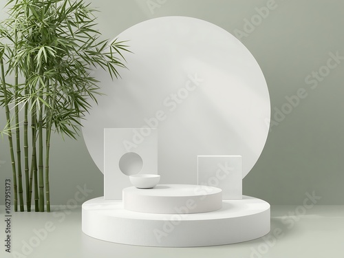Minimalist white podium display with bamboo plant, circle background, and bowl for product presentation isolated on white background