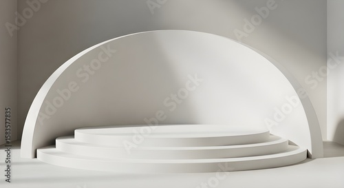Minimalist White Product Display: Three-Tiered Circular Platform with Arch Background, Soft Lighting, Modern Aesthetic.
